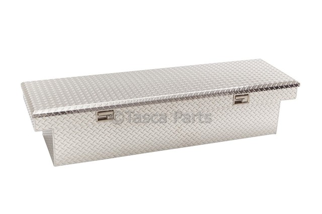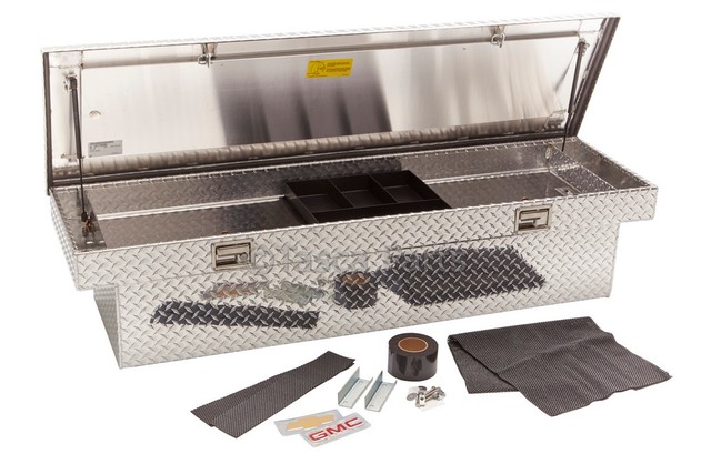 - Description: Bright Polished Diamond Plate Finish with Bowtie Logo. Tool box comes complete with all mounting hardware, dual latch mechanism, plastic tool tray and box bottom liner. No drilling required for tool box to truck bed rail installation. The single cover style provides easy access for larger, bulkier items.Built to last?constructed of .075" diamond-plate aluminumHandles over 250 lbs of stored equipment.Removable sliding tray with rubber isolation mat.Foam filled lid supports 500 lbsFull-length stainless steel hinge.Dual gas shocks for smooth opening and closing. One-Touch Latching Mechanism includes 2 keys.